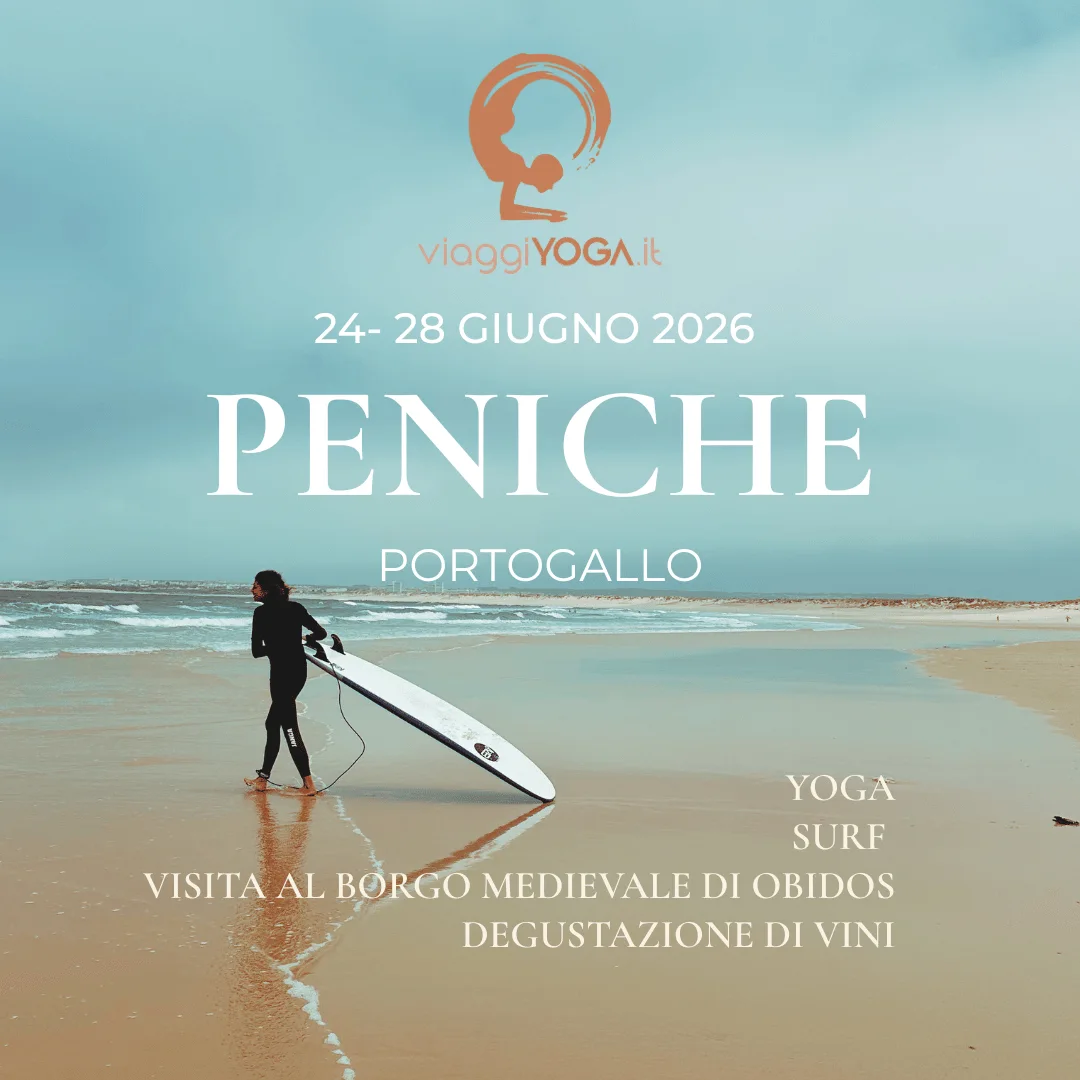 Yoga retreat Portogallo tra oceano, libertà e riconnessione. A Peniche, dal 24 al 28 giugno 2026, ti aspetta un’esperienza trasformativa tra yoga, surf, natura e relax: 4 notti in surf & yoga house, brunch quotidiano, pratiche con Milva Perinetti, 2 lezioni di surf, visita al borgo medievale di Óbidos e degustazione di vini locali. Un viaggio pensato per ritrovare equilibrio, leggerezza e presenza, in armonia con il gruppo e con l’energia dell’Atlantico.